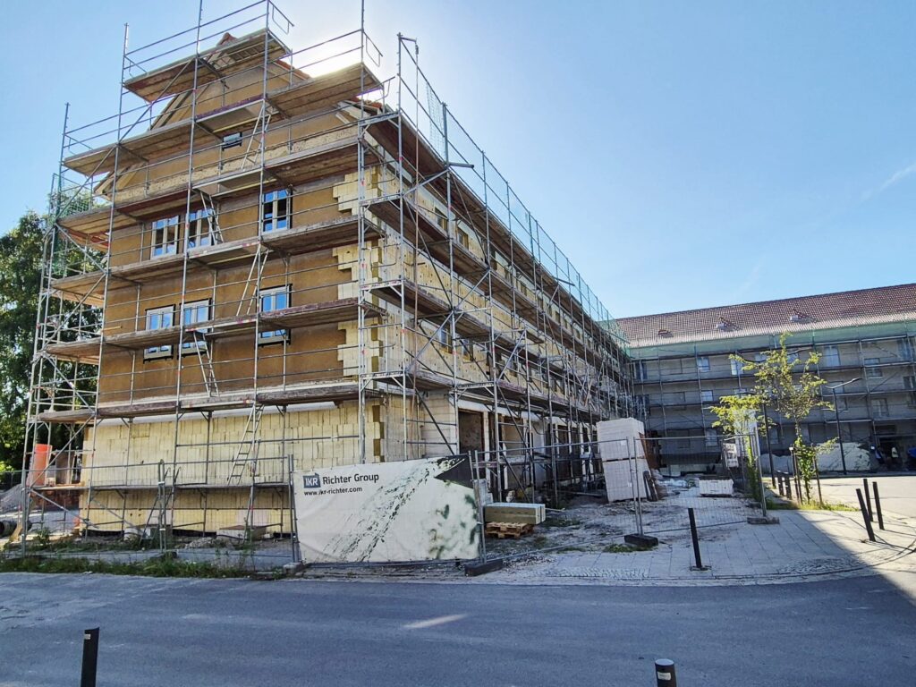 Im Innenbereich neigen sich die Rohbauarbeiten dem Ende. Es sind nun alle neuen Träger verbaut. Die letzten Deckenfelder können am Donnerstag mit Beton verfüllt werden. Statisch sind wir nun viel besser, als das Gebäude jemals war 😉. Auch die Fassadenarbeiten sind weit fortgeschritten, die letzten Dämmungsarbeiten werden auch demnächst abgeschlossen. Da auch die Fenster fast alle verbaut sind, können wir bald mit dem Innenausbau voranschreiten.